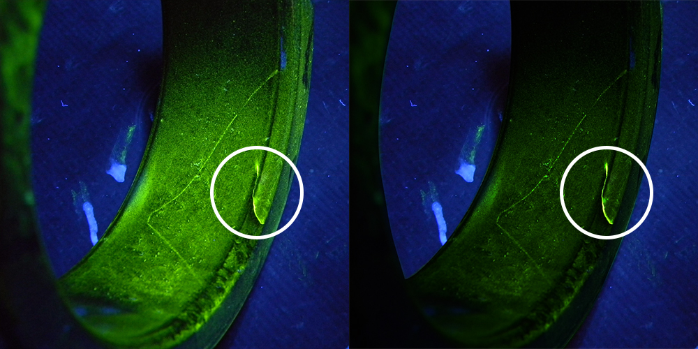 V prípade penetrantov je dôležité, aby fluorescencia penetrantu vydržala počas spracovania, aby indikácie boli pri vyhodnocovaní stále ostré a jasné. Niektoré penetranty sa môžu rozložiť pod vplyvom tepla (v sušičke) a silného UV žiarenia (v jasnej UV kontrolnej kabíne), preto sa uistite, že máte odolný penetrant, ktorý je navrhnutý tak, aby si zachoval svoju fluorescenciu. To je obzvlášť dôležité, ak vaše špecifikácie vyžadujú dlhšie časy schnutia alebo ak existuje časové oneskorenie medzi spracovaním dielov a ich kontrolou.